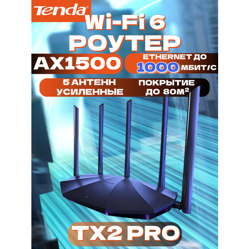 Tenda Wi-Fi 6 Роутер TX2 Pro, Гигабитный, AX1500, интернет до 1000 мбит/с, Wi-Fi+(Mesh Система),80MHz, двухдиапазонный