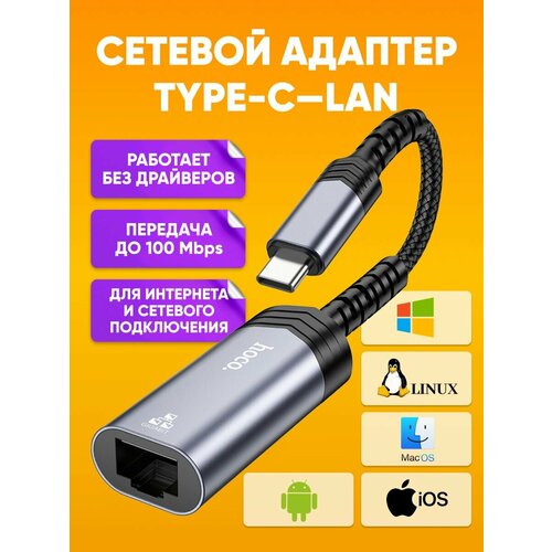 Сетевой Ethernet адаптер переходник USB Type-C - LAN Rj45 HOCO UA26, черный / Лан-кабель коннектор 100 Mbps для интернет кабеля / Внешняя сетевая карта USB Type-C - Ethernet RJ45