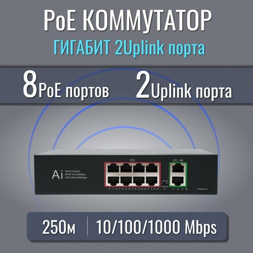 Коммутатор (свитч) PoE 8 портов +2 LAN Гигабит для IP видеонаблюдения