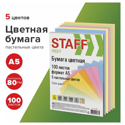 Бумага цветная для принтера офисная Staff Profit Малого Формата (148х210 мм), А5, 80 г/м2, 100 л. (5цв. х 20 л.), цветная пастель, 110891