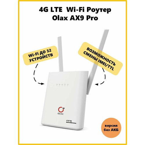 Состав комплекта:4G-LTE Wi-Fi роутер OLAX AX6 Pro для подключения к Интернету через мобильные сети.◆ универсален для любых сим-карт: все операторы + смарт-сим (IMEI + fixed TTL). ◆ поддерживает все частотные диапазоны в 2G/3G/4G-LTE. ◆ дает высокую скорость загрузки – до 150 Мбит/с (в сетях 4G-LTE). ◆ разворачивает Wi-Fi сеть с большой площадью покрытия – до 250 м2, достаточной для частного дома и офиса. ◆ точка доступа Wi-Fi обеспечивает беспроводным подключением одновременно до 32 клиентов. ◆ оснащен гигабитным Ethernet-портом для подключения ПК и др. устройств по локальной сети, который также может быть использован для подсоединения кабеля Интернет-провайдера. ◆ прост в использовании: для начала работы достаточно вставить сим-карту и подключить роутер к электросети, настройка и управление выполняются через web-интерфейс. ◆ плюсом данной комплектации является наличие внешней батареи на 4000m