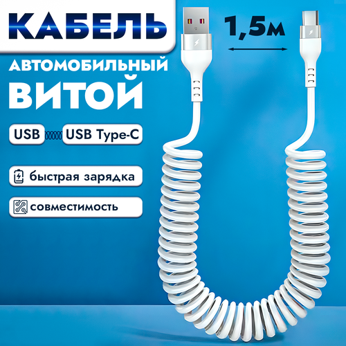 Автомобильный витой кабель USB - TYPE C. Зарядка для телефона в машину 1.5м. Белый.