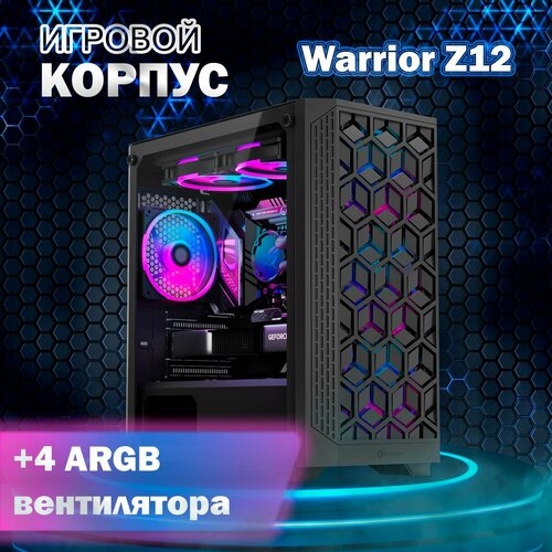 Компьютерный корпус Prime Box Warrior Z12 + 4 вентилятора ARGB + закаленное стекло, черный