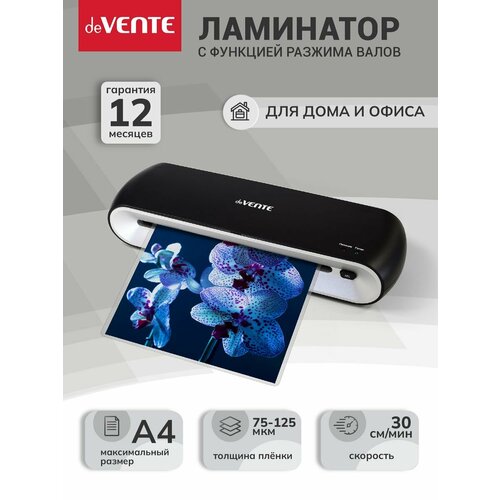 Ламинатор A4 DV745 deVENTE имеет габаритные размеры 360x102x66 мм, подходит для горячего ламинирования дома и в офисе, с функцией "...