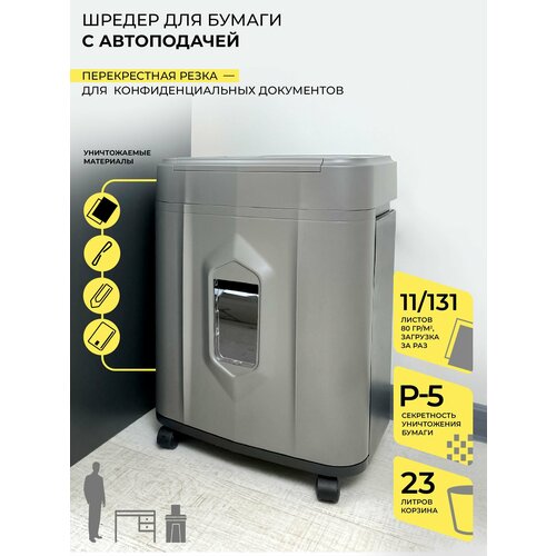Шредер для бумаги гелеос АП23-5, скоб, скрепок, пластиковых карт c автоподатчиком, уровень секретности P-5, до 13 листов за раз, корзина 23 л