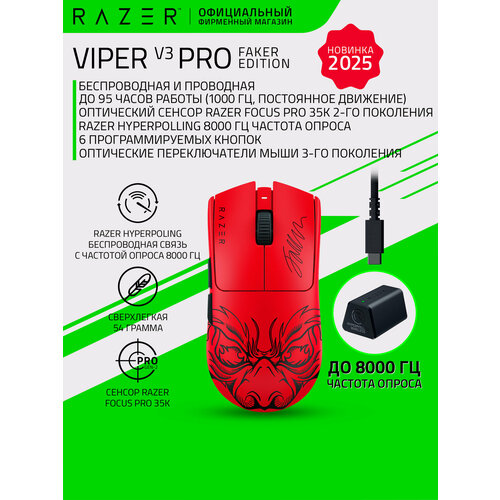 Игровая мышь Razer Viper V3 Pro (Faker) Беспроводная и Проводная, Частота опроса до 8000Гц, 35.000 DPI, 6 кнопок, 54 г