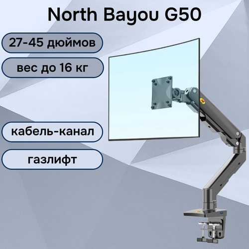 черный, серебристыйНастольный игровой кронштейн NB A6 с газлифтом для монитора на струбцине к столешнице, наклонно-поворотный. Подходит для мониторов с диагональю 27-50 дюймов весом 2-18 кг. Используется как кронштейн для изогнутых мониторов, широкоформатных моделей, в том числе Odyssey G7 и G9. Кронштейн для игрового монитора North Bayou идеален для оптимальной организации пространства геймера, студента. Даёт возможность настроить комфортный и эргономичный угол просмотра и высоту экрана для гейминга и стриминга. Вы сможете организовать рабочее место с учётом индивидуальных особенностей: освещения, высоты, размера стола и других аспектов. Немаловажным преимуществом является то, что с помощью настольного кронштейна Вы освободите дополнительное пространство на рабочей поверхности. Всё это благодаря механизму с возвратной пружиной и газовым амортизатором, располагающимся внутри корпуса кронштейна North Bayou. Механизм позволяет зафиксировать монитор в любом положении и менять его, не прилагая существенных усилий. Стильное креплени