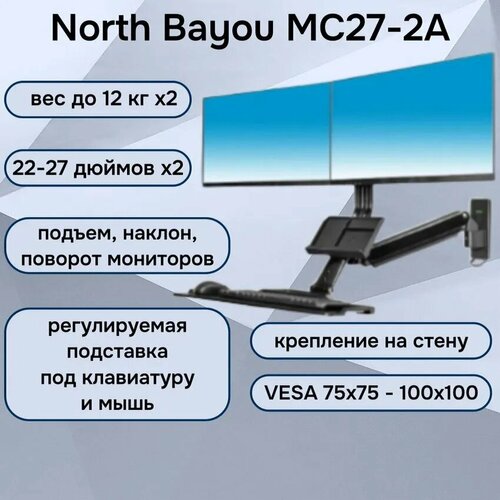 Настенная рабочая станция для двух мониторов 22-27" до 12 кг с подставкой для клавиатуры и мышки North Bayou NB MC27-2A, черная
