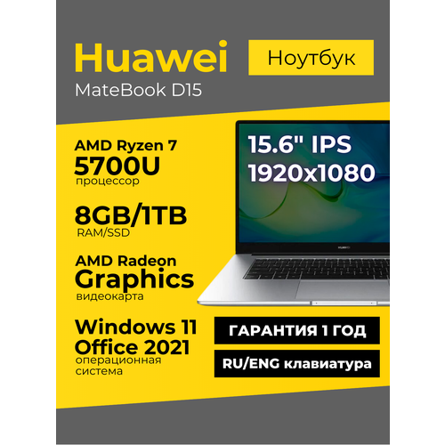 Ноутбук Huawei MateBook D15 15.6 IPS FHD Ryzen 7 5700U 8ГБ 1ТБ AMD Radeon Graphics Космический серый Windows 11+Office