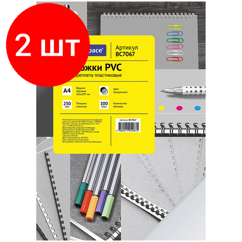 Комплект 2 шт, Обложка А4 OfficeSpace "PVC" 250мкм, прозрачный бесцветный пластик, 100л.