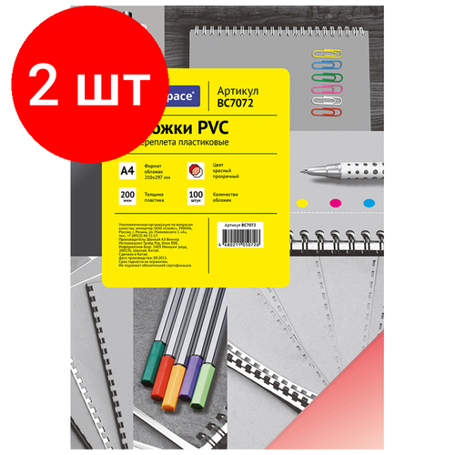 Комплект 2 шт, Обложка А4 OfficeSpace "PVC" 200мкм, прозрачный красный пластик, 100л.