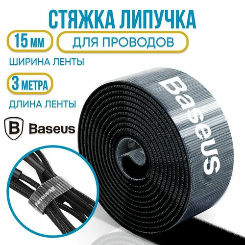 Органайзер лента-стяжка для проводов на липучке, premium quality, 3 метра, Baseus, черный