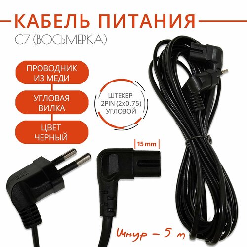 Кабель питания C7 (восьмерка), угловой разъем угловая вилка, 2x0.75mm, длина шнура 5 метров