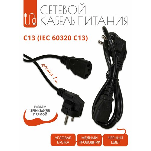 Кабель питания C13 с угловой вилкой и прямым разъемом 3x0.75 мм, 1 метр