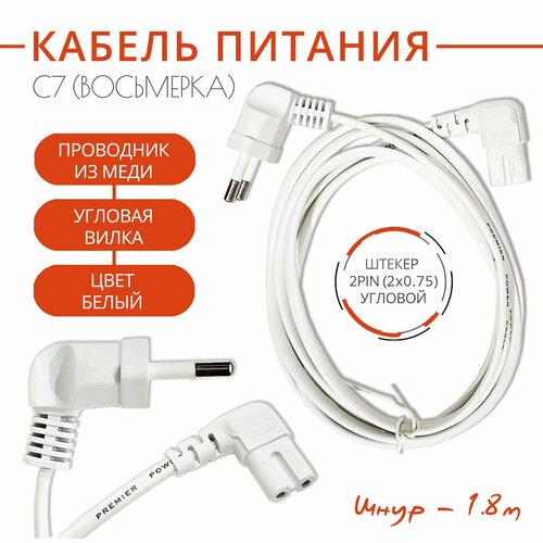 Кабель питания C7 (восьмерка), угловой разъем 2x0.75 - угловая вилка, длина шнура 1.8 м