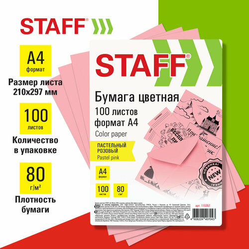 Бумага цветная STAFF, А4, 80 г/м2, 100 л, пастель, розовая, для офиса и дома, 115357 упаковка 4 шт.