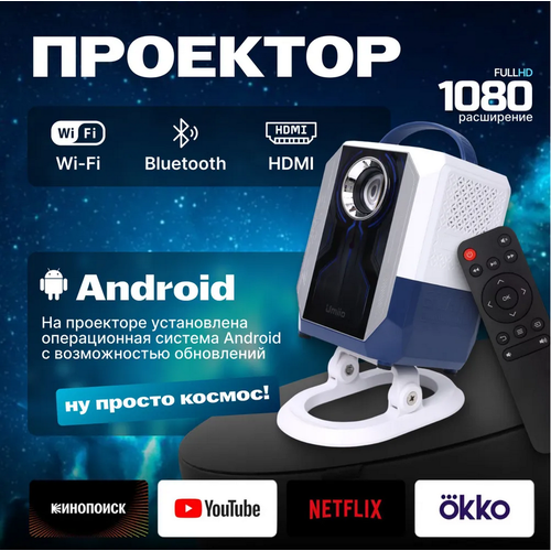 Портативный проектор, Проектор UMIIO Full HD 1080p 5G Android TV, Видеопроектор для для дома, дачи, офиса, Белый