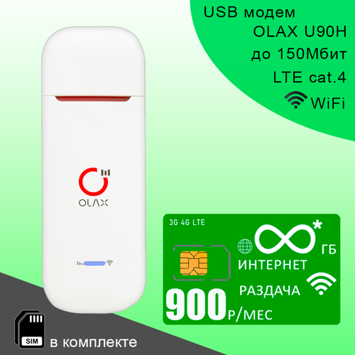 Комплект с безлимитным интернетом и раздачей за 600р/мес, беспроводной 3G/4G/LTE модем OLAX U90H-E + сим карта