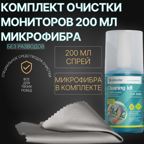 Чистящий спрей Defender для экранов / пластиковый флакон с пульверизатором 200 мл + микрофибра 20 х 20 см / Беларусь.
