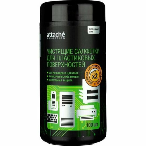белый, черныйСалфетки влажные Attache Selection Professional для экранов (100 штук в тубе) Влажные салфетки Attache Selection Professional изготовлены из крепированной бумаги, предназначены для очистки LCD экранов мониторов, телевизоров, плазменных панелей, ноутбуков, стеклянных поверхностей сканеров и копиров и других поверхностей. Не оставляет разводов и ворса. Специальный состав с активными компонентами пролонгированного действия безупречно очищает поверхности от пыли и грязи, позволяет в 2 раза эффективнее удалять отпечатки пальцев и защищать экран на более длительный срок. Специально разработанная формула состава с антистатическим компонентом предотвращает оседание пыли в 2 раза дольше, в отличие от обычных салфеток. Удобная туба-диспенсер с большой крышкой-дозатором, препятствующая высыханию салфеток. Салфетки изготовлены из полностью биоразлагаемого материала. Применяется материал повышенной плотности на 20% в отличие от обычных салфеток, что позволяет избежать обрыва салфеток при вытаскивании. Размер одной салфетк