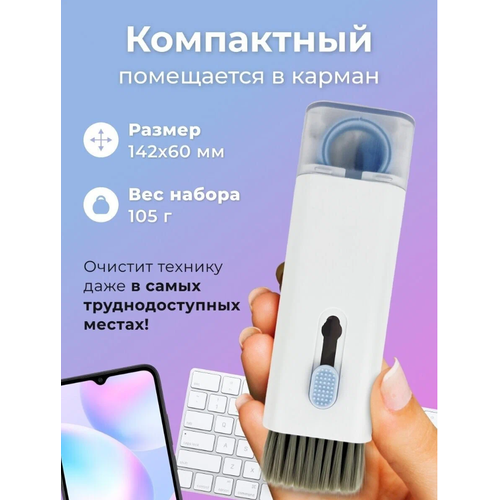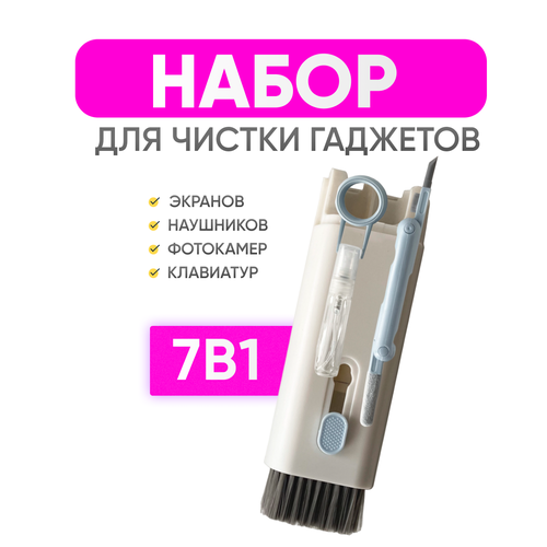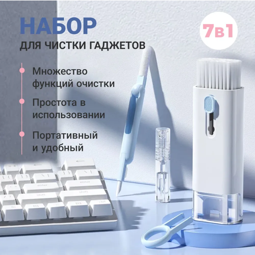 белый, синий, голубойМногофункциональный набор для чистки гаджетов, клавиатуры и наушников 7 в 1. Аксессуары для чистки и детейлинга электроники 7 в 1 предназначены для чистки широкого спектра электронных устройств, так как набор вмещает в себя всё необходимое: 1. Щетка для чистки клавиатуры - 1 шт; 2. Щетка для чистки наушников и чехла - 1 шт; 3. Перо для чистки наушников и чехла - 1 шт; 4. Кольцо для снятия клавиш - 1 шт; 5. Флок губка – 1 шт; 6. Флок губка для влажной чистки дисплея - 1 шт; 7. Пустая мини-бутылочка с пульверизатором (без жидкости) - 1 шт. Большой набор для чистки электроники прост в использовании и подойдет для очистки беспроводных и проводных наушников, airpods, телефонов, планшетов, клавиатур, фотоаппаратов и других гаджетов. Эргономичный дизайн и компактный размер современного очистительного набора позволит носить его с собой: в сумке, портмоне или даже обычном кармане. Полезный набор для чистки электронных устройств бережно и эффективно очистит ваши любимые гаджеты в самых труднодоступных местах. Набор для