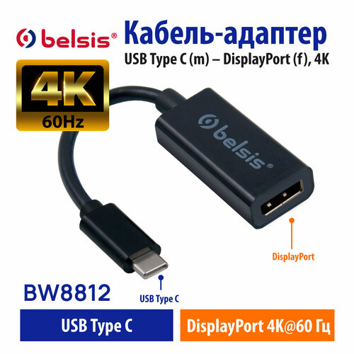 Адаптер USB Type C- DisplayPort Belsis 4K@60Гц, 2K 165Гц, 0,2м, совместим Thunderbolt 3 и 4, MacBook Pro, Galaxy S20 и др/BW8812