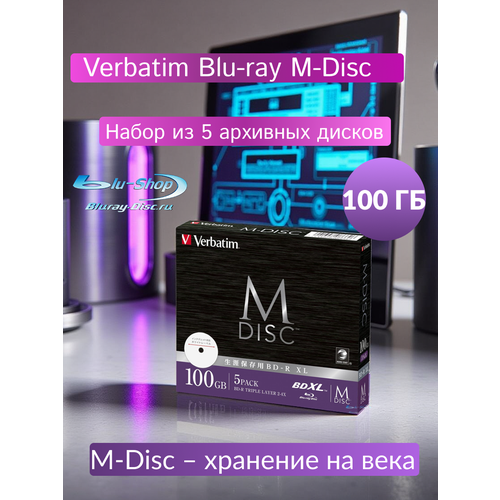 Диски чистые Verbatim Blu-ray M-DISC BDXL 2-4X, 100GB, Slim Case, 5 PACK, Inkjet Printable