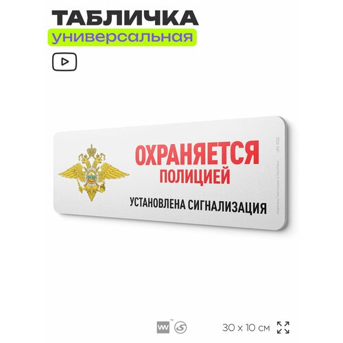 Табличка "Охраняется полицией, установлена сигнализация", на дверь и стену, информационная, пластиковая с двусторонним скотчем, 30х10 см, Айдентика Технолоджи