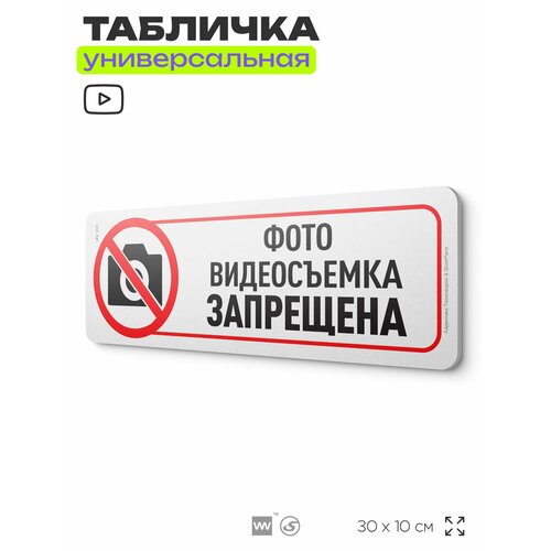 Табличка "Фото и видеосъемка запрещена", на дверь и стену, информационная, пластиковая с двусторонним скотчем, 30х10 см, Айдентика Технолоджи