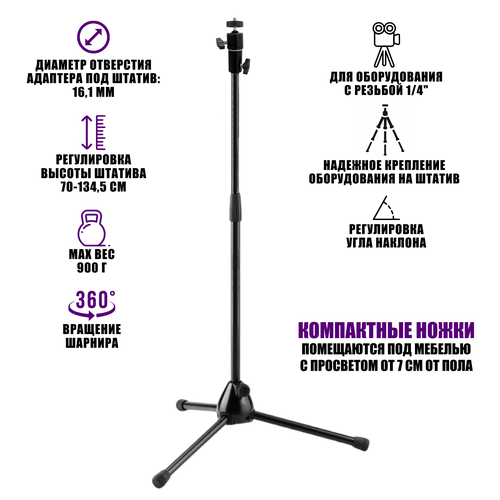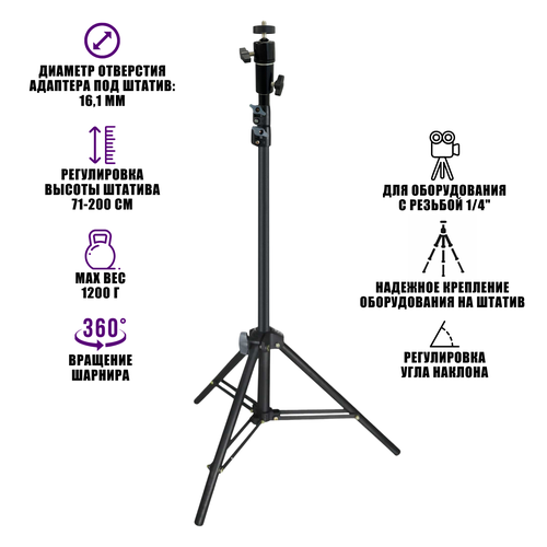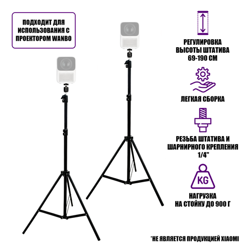 черныйУниверсальный штатив JBH-Pr900 для проектора весом до 900 г, высота 1.9 м - идеальное решение для установки проектора. Мини проектор используется для домашнего кинотеатра. Подойдет также для проведения презентаций в небольших офисах, просмотра мультфильмов с детьми. Не всегда удобно установить проектор стационарно. В таких случаях можно использовать специальный штатив. Как подставка для проектора, он еще и регулирует высоту расположения прибора. Универсальная телескопическая стойка для проектора. Высота штатива от 69 до 190 см. За счет шарнирного крепления регулируется угол проекции, благодаря вращению на 360° по горизонтали и на 90° по вертикали. Резьба крепления преоктора 1/4". Штатив подходит для использования с проектором WANBO, но не является оригинальной продукцией Xiaomi. Кроме того, универсальность стойки в том, что кроме установки проектора, она подходит для съемки фото-видео, телефона (смартфона, айфона), фотоаппарата, и кольцевой лампы.