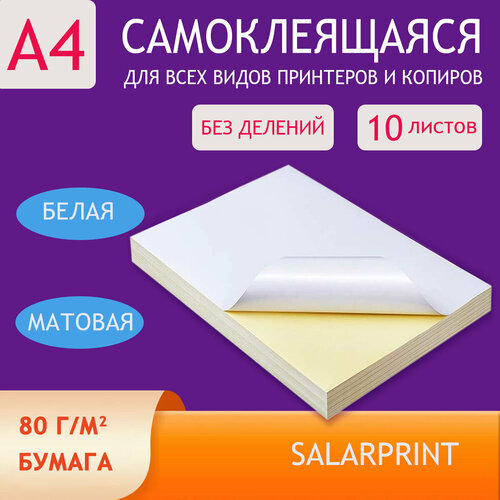 Бумага самоклеящаяся, SalarPrint, белая матовая, А4, для печати на принтере наклеек, этикеток, штрих-кодов, 10 листов