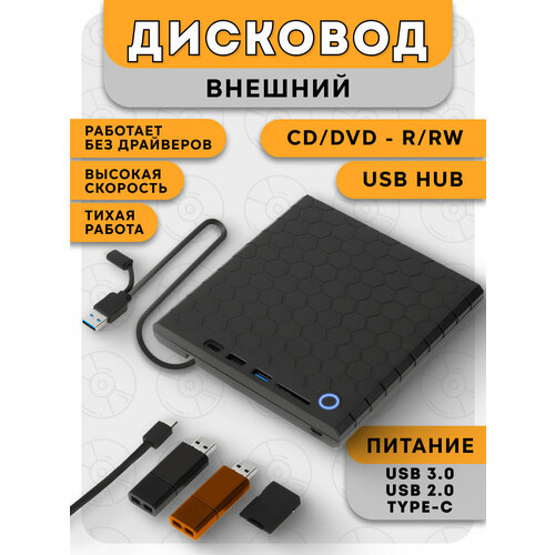 Внешний дисковод DVD/CD с USB 3.0 и Type-C, встроенный хаб и кардридер, для ноутбука и ПК