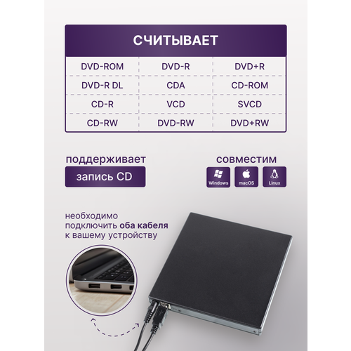 Если у вас сломался DVD привод на компьютере или ноутбуке, а вам нужно регулярно считывать информацию, хранящуюся на CD и DVD дисках, то мы предлагаем простое, эффективное и доступное по стоимости решение – внешний DVD/CD дисковод. Он подключается к любому современному компьютеру или ноутбуку, имеющему USB интерфейс, работает быстро, надежно, занимает немного места. Это универсальный дисковод, который сможет считывать информацию с DVD и CD дисков.
