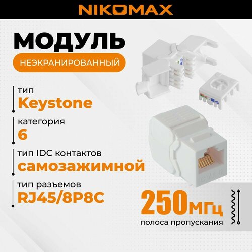 Модуль-вставка NIKOMAX типа Keystone Essential Line, Кат.6, RJ45/8P8C, самозажимной, NMC-KJUE2-ET-WT