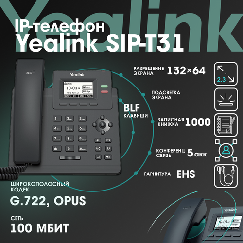 IP-телефон Yealink SIP-T31, 2 SIP аккаунта, монохромный 2,3 дюйма дисплей 132 x 64, конференция на 5 абонентов, поддержка EHS.