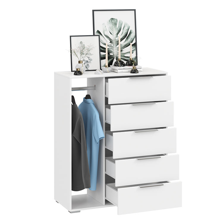 Корпус выполнен из качественного ЛДСП, который отличается высокой прочностью и устойчивостью к механическим повреждениям. Фасад оформлен в светлых тонах, что позволяет визуально расширить пространство помещения. На верхней части конструкции расположены две открытые ниши, которые предназначены для хранения различных предметов. Также есть два выдвижных ящика и штанга для вешалок. Благодаря этому изделие подходит для размещения одежды, постельного белья, полотенец и других вещей.