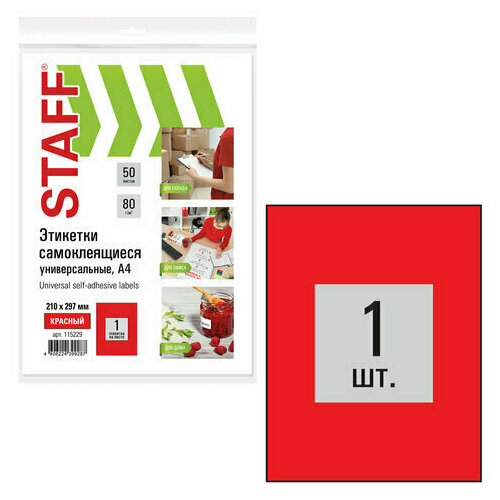 Этикетка самоклеящаяся 210х297 мм, 1 этикетка, красная, 80 г/м2, 50 листов, STAFF, 115229