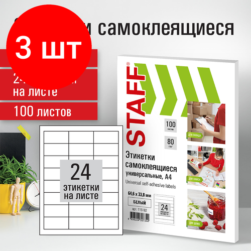 Комплект 3 шт, Этикетка самоклеящаяся 64.6х33.8мм, 24 этикетки, белая, 70г/м2, 100 листов, STAFF, Ко, 115182