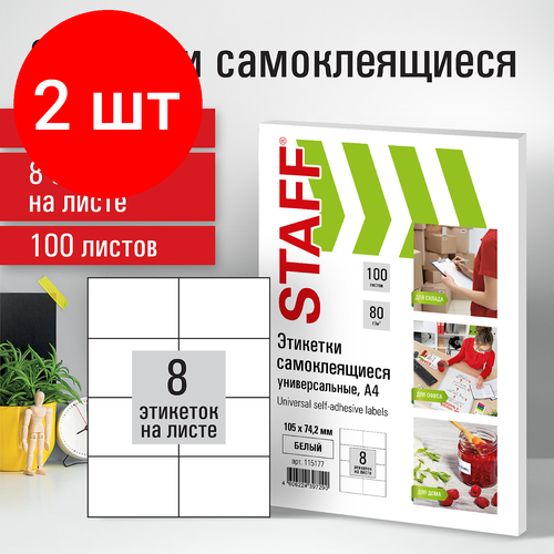 Комплект 2 шт, Этикетка самоклеящаяся 105х74.2мм, 8 этикеток, белая, 70г/м2, 100 листов, STAFF, Код_, 115177