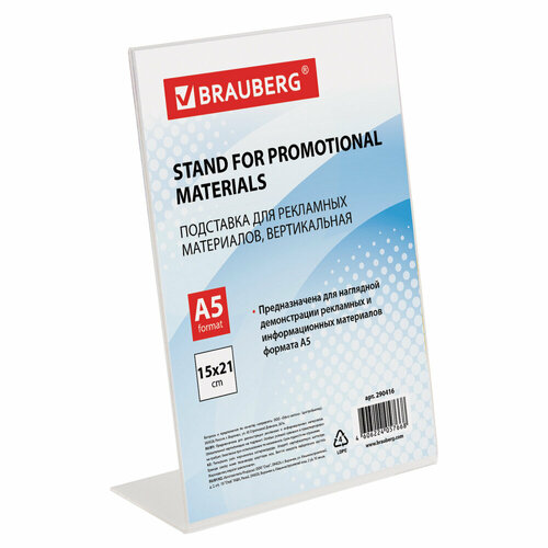 Подставка настольная для рекламных материалов малого формата (150х210 мм), А5, односторонняя, вертикальная, BRAUBERG, 290416 упаковка 4 шт.