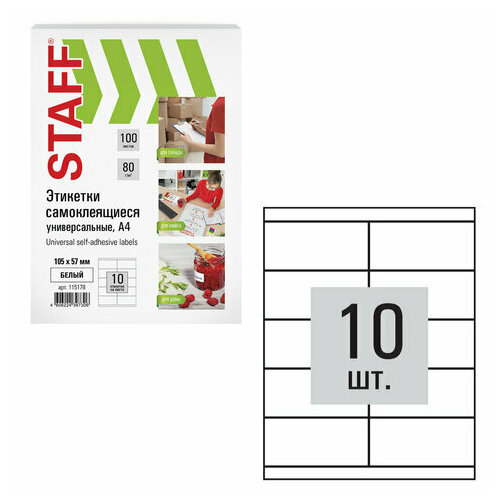 Этикетка самоклеящаяся Staff 115178 105х57мм, 10 этикеток, белая, 80г/м2, 100 листов
