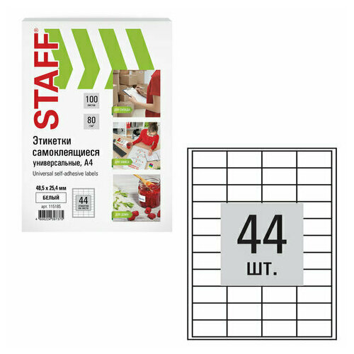 Этикетка самоклеящаяся 48,5х25,4 мм, 44 этикетки, белая, 80 г/м2, 100 листов, STAFF, 115185