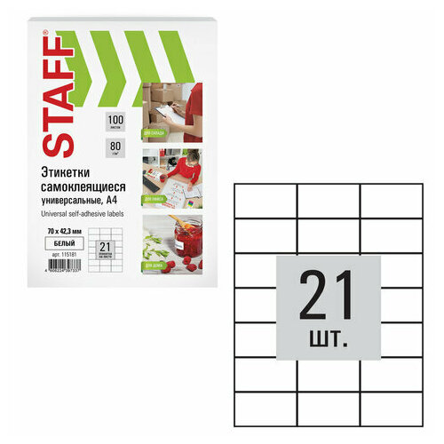 Этикетка самоклеящаяся Staff 115181 70х42.3мм, 21 этикетка, белая, 80г/м2, 100 листов