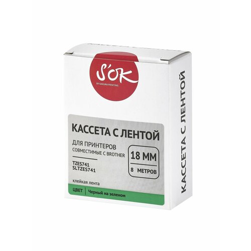 Кассета с лентой TZES741 для Brother, на зеленом, ширина 18мм, длина 8м , SOK