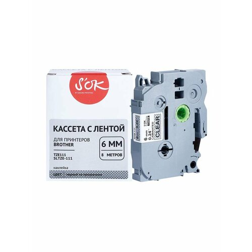 Кассета с лентой TZE-111 для Brother PT-E550WVP, PT-H110, PT-P700 S'OK черный на прозрачном, 6мм/8м, наклейка