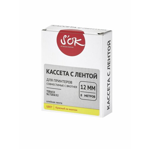 Кассета с лентой TZE632 для Brother, на желтом, ширина 12мм, длина 8м , SOK