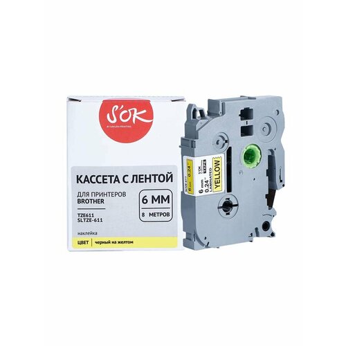 Кассета с лентой TZE-611 для Brother PT-E550WVP, PT-H110, PT-P700, PT-E110VP S'OK черный на желтом, 6мм/8м, наклейка