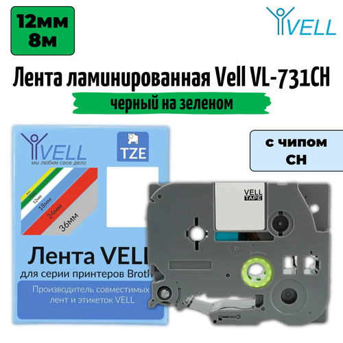 Лента ламинированная Vell VL-731CH (12 мм, черный на зеленом) С чипом