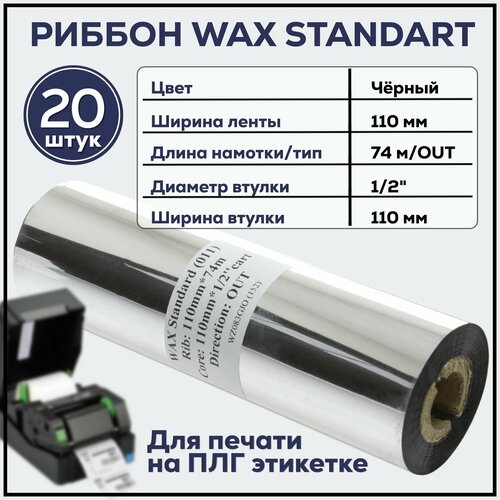 20 штук. Черный риббон WAX (110 мм x 74 м x 1/2" x 110 мм) OUT