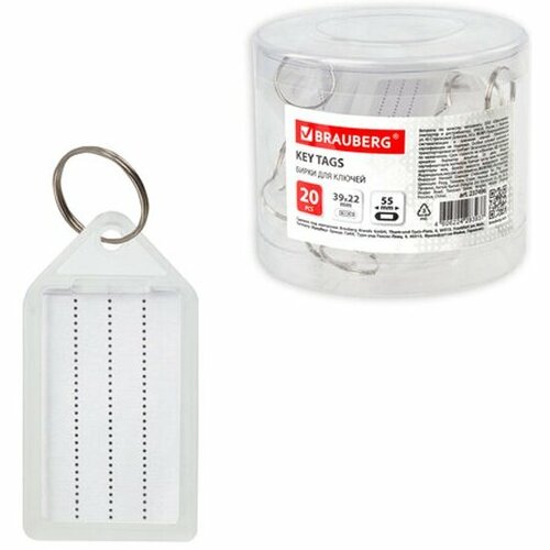 Бирки для ключей BRAUBERG комплект 20 ШТ, длина 55 мм, инфо-окно 39х22 мм, прозрачные, , 237496, 95